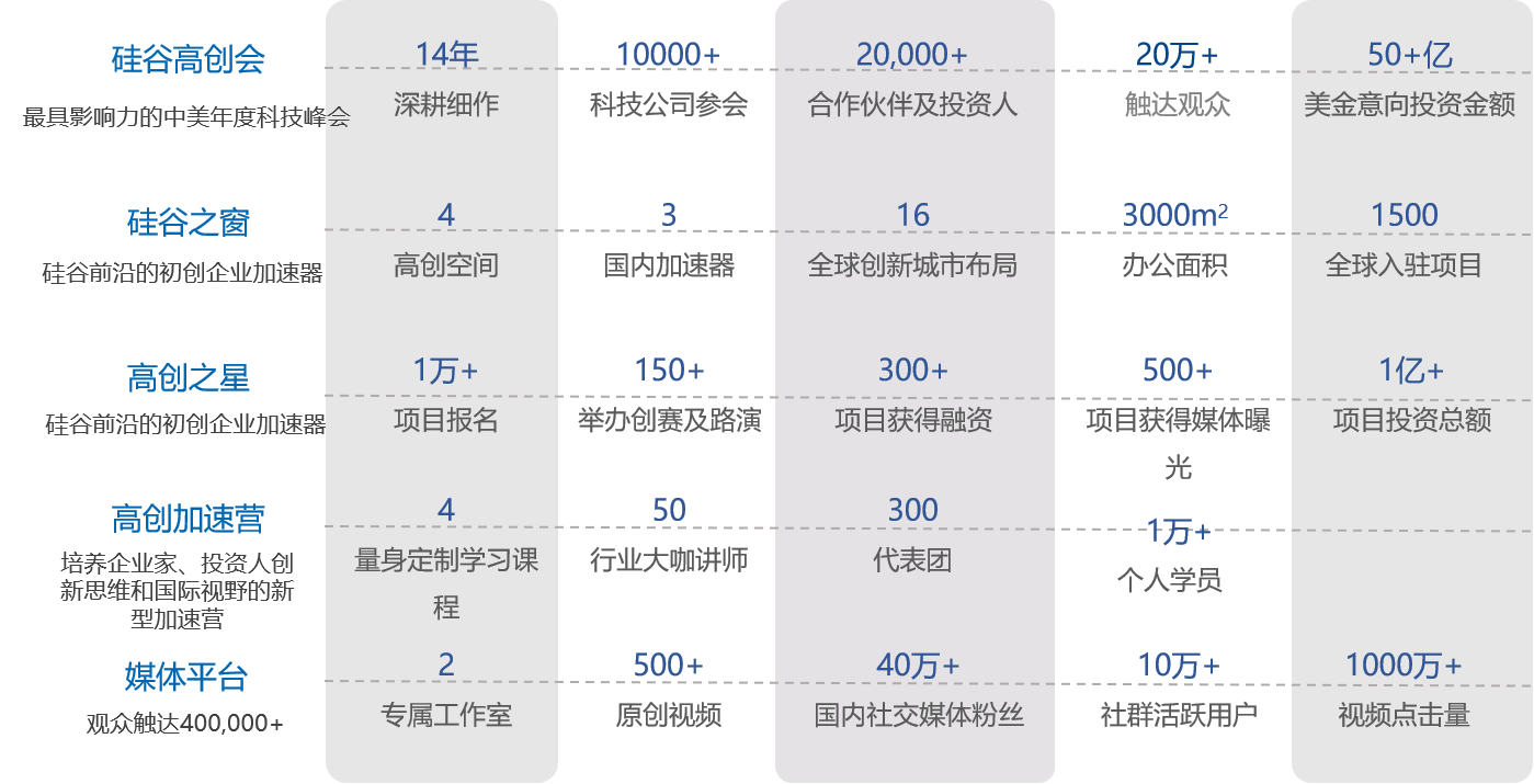硅谷高创会目前已为超过1000家中美科技企业,包括超过8家独角兽企业提供创业咨询、资源对接、品牌宣传、会员服务、培训、公关等在内的多样化服务,成功打造中美之间最具影响力的创业创新生态圈之一。与硅谷高创会深度合作的50家中美顶级投资机构, 已投资硅谷高创会服务企业超过300家,投资总额超过1亿人民币。